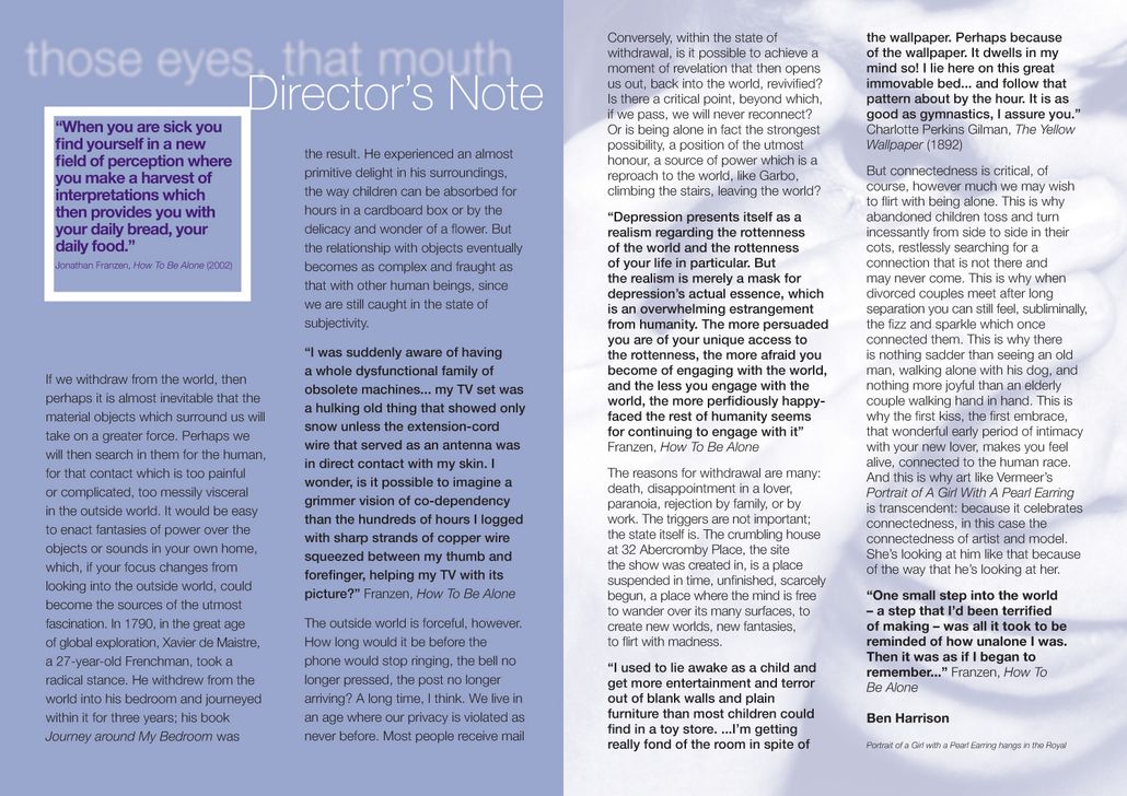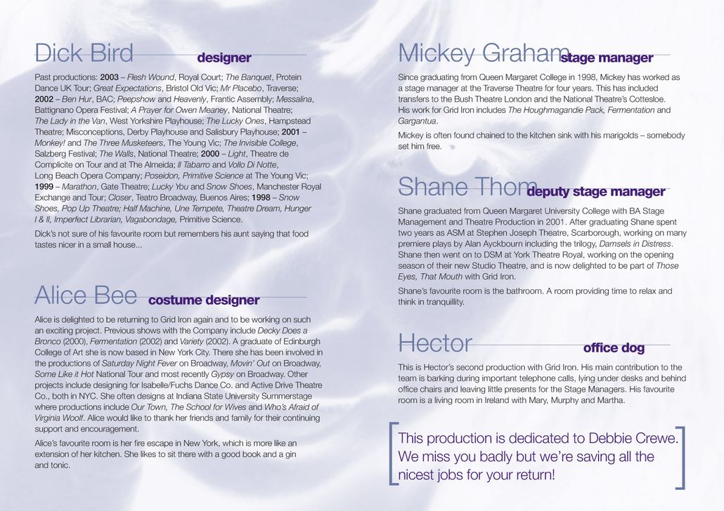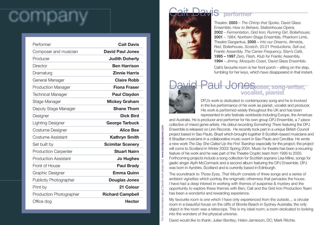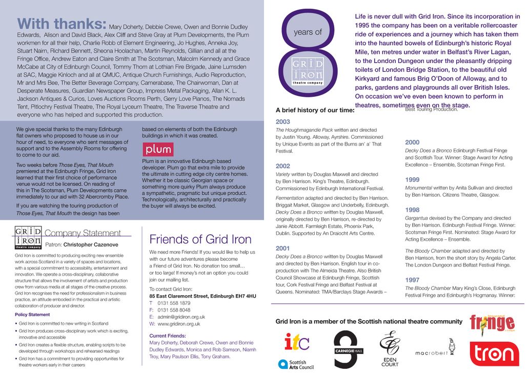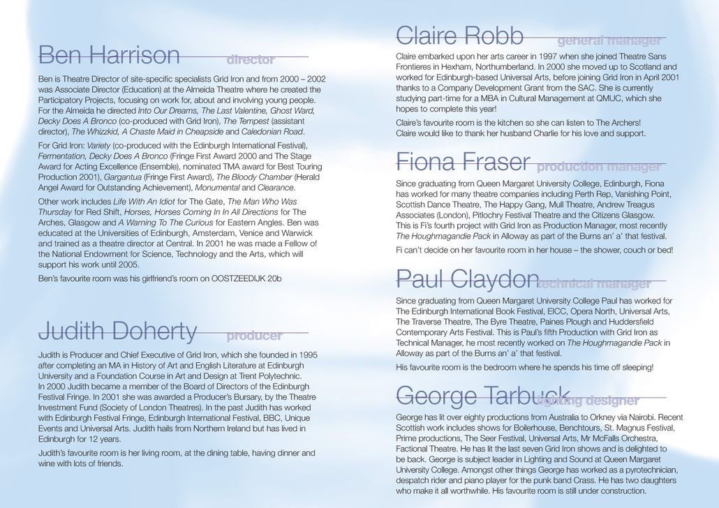 Performed in 32 Abercromby Place as part of the Edinburgh Festival Fringe 2003 then relocated to Eden Court Theatre Inverness, Tron Theatre Glasgow, Carnegie Hall Dunfermline and macrobert Stirling.
